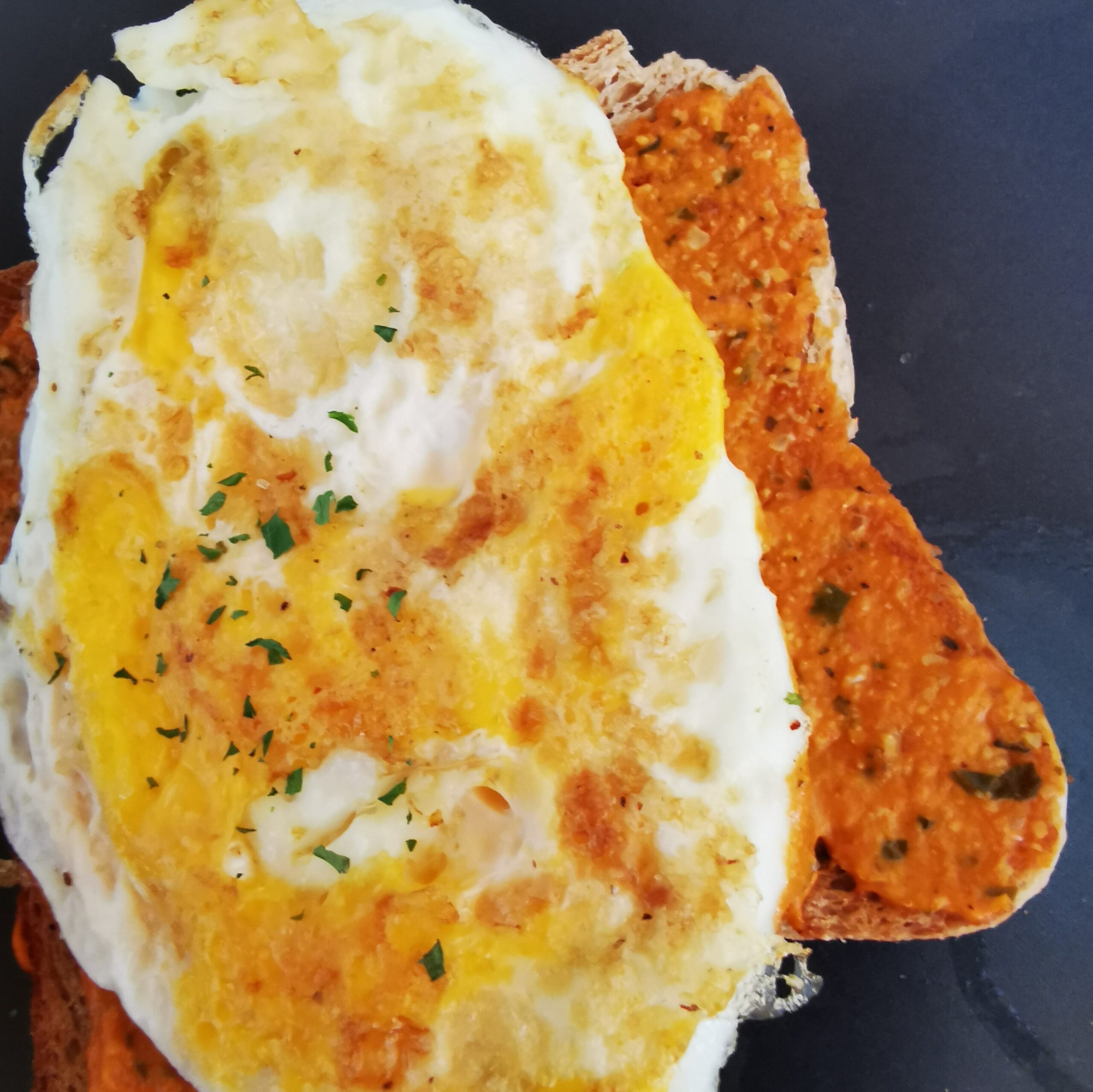 1. Ei aufschlagen und in Pfanne geben, von beiden Seiten braten und würzen.